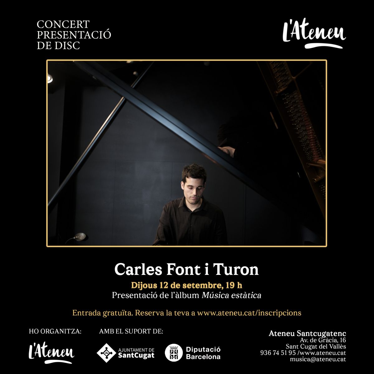 12-09-2024Concert “Moviment estàtic” | + agenda 12-09-2024 19:00 12-09-2024 19:00 Europe/Madrid Concert “Moviment estàtic” Ateneu Santcugatenc Ateneu Santcugatenc Carles Font - Pianista - www.carlesfont.com carlesfontpiano@gmail.com | ||