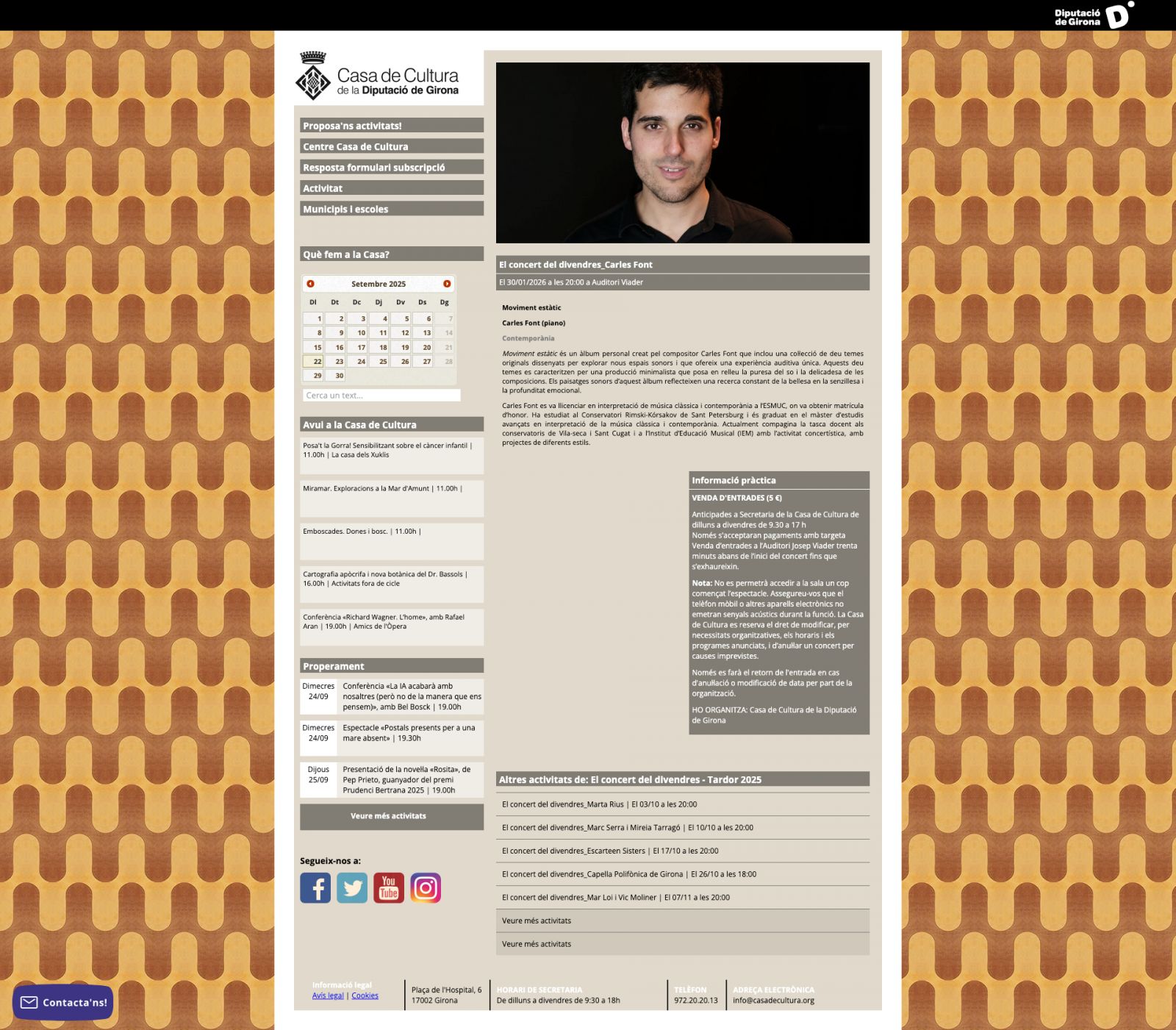 30-01-2026Moviment Estàtic | + agenda 30-01-2026 20:00 30-01-2026 20:00 Europe/Madrid Moviment Estàtic Casa de Cultura Casa de Cultura Carles Font - Pianista - www.carlesfont.com carlesfontpiano@gmail.com | ||